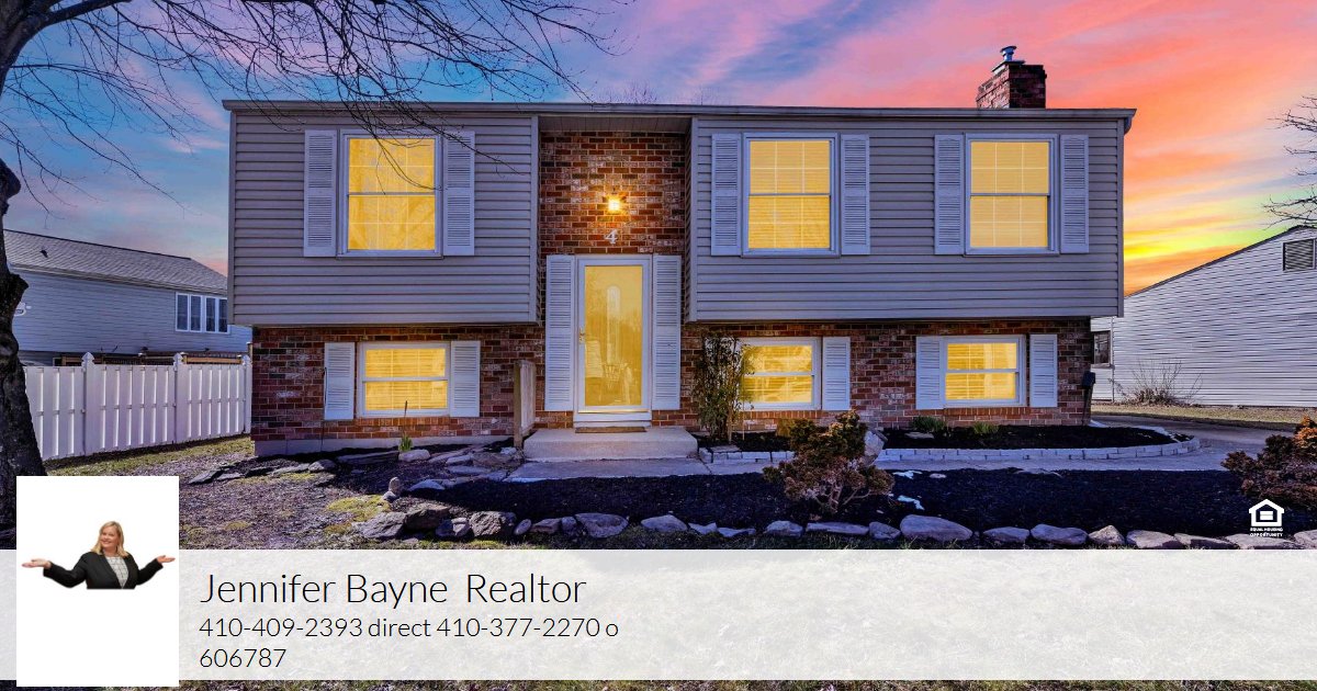 Experience serenity at 4 Ayr Court. Step into this charming 3-bedroom split foyer home and breathe in the tranquility. The main level features gleaming hardwood floors, a modern kitchen featuring Corian counters, and an updated hall bath. Unwind in the inviting 3-season sunroom, perfect for losing yourself in a good book. The primary bedroom’s walk-in closet presents an opportunity for an ensuite bath. Descend to the bright and airy lower level adorned with decorative trim and fresh paint. Cozy up by the pellet stove or indulge in the ultimate relaxation with a sauna session in the full bath. Let the warmth envelop you, melting away the day's stresses while soft lighting and soothing music set the mood. Cap off your evening next to the pellet stove, cocooned in comfort. Discover endless possibilities in the bonus room, ideal for a home office, personal fitness haven, or whatever your heart desires. The laundry room offers ample storage space and convenient walk-up stairs to the rear yard. But don’t linger in daydreams—this home awaits your presence. And did you notice? It’s just a stone’s throw away from the White Marsh Swim Club, adding another layer of leisure to your lifestyle.
